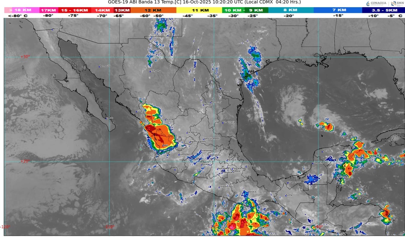 El ingreso de aire húmedo del océano Pacífico y golfo de México, canales de baja presión en el interior del país, así como inestabilidad atmosférica sobre el centro de la República Mexicana, originarán lluvias puntuales muy fuertes en Nayarit y Jalisco; puntuales fuertes en Sinaloa, Durango, Colima y Michoacán; intervalos de chubascos en Puebla, Morelos y Estado de México; y lluvias aisladas en zonas de Tlaxcala, Ciudad de México, Hidalgo, Querétaro y Zacatecas.